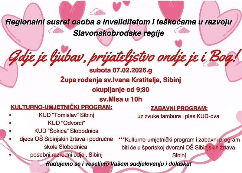 Uz geslo „Gdje je ljubav, prijateljstvo ondje je i Bog“, Povjerenstvo za pastoral osoba s invaliditetom i njihovih obitelji Đakovačko- osječke nadbiskupije, animatori i predstavnici udruga osoba s invaliditetom slavonskobrodske regije organiziraju susret osoba s invaliditetom i članova njihovih obitelji u subotu, 7. veljače 2026. u župnoj crkvi Rođenja sv. Ivana Krstitelja u Sibinju.